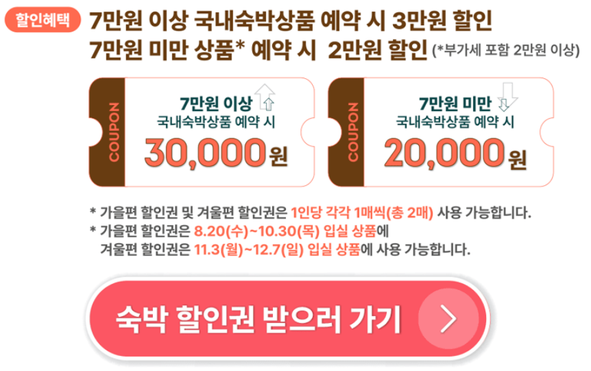 - 7만원 이상 국내 숙박상품 예약 시: 3만원 할인