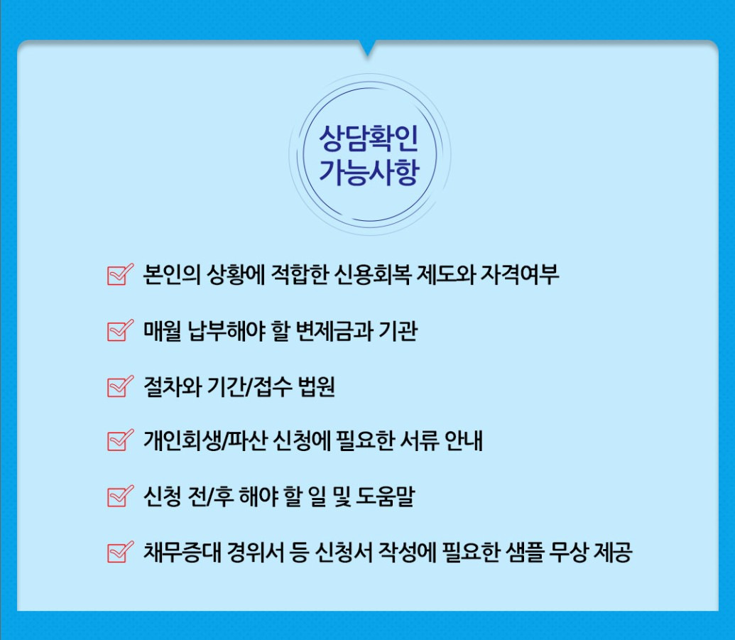 상담을 통해 개인회생과 파산 중 어떤 절차가 적합한지 판단할 수 있으며, 예상 변제액과 신청 자격도 구체적으로 확인할 수 있습니다