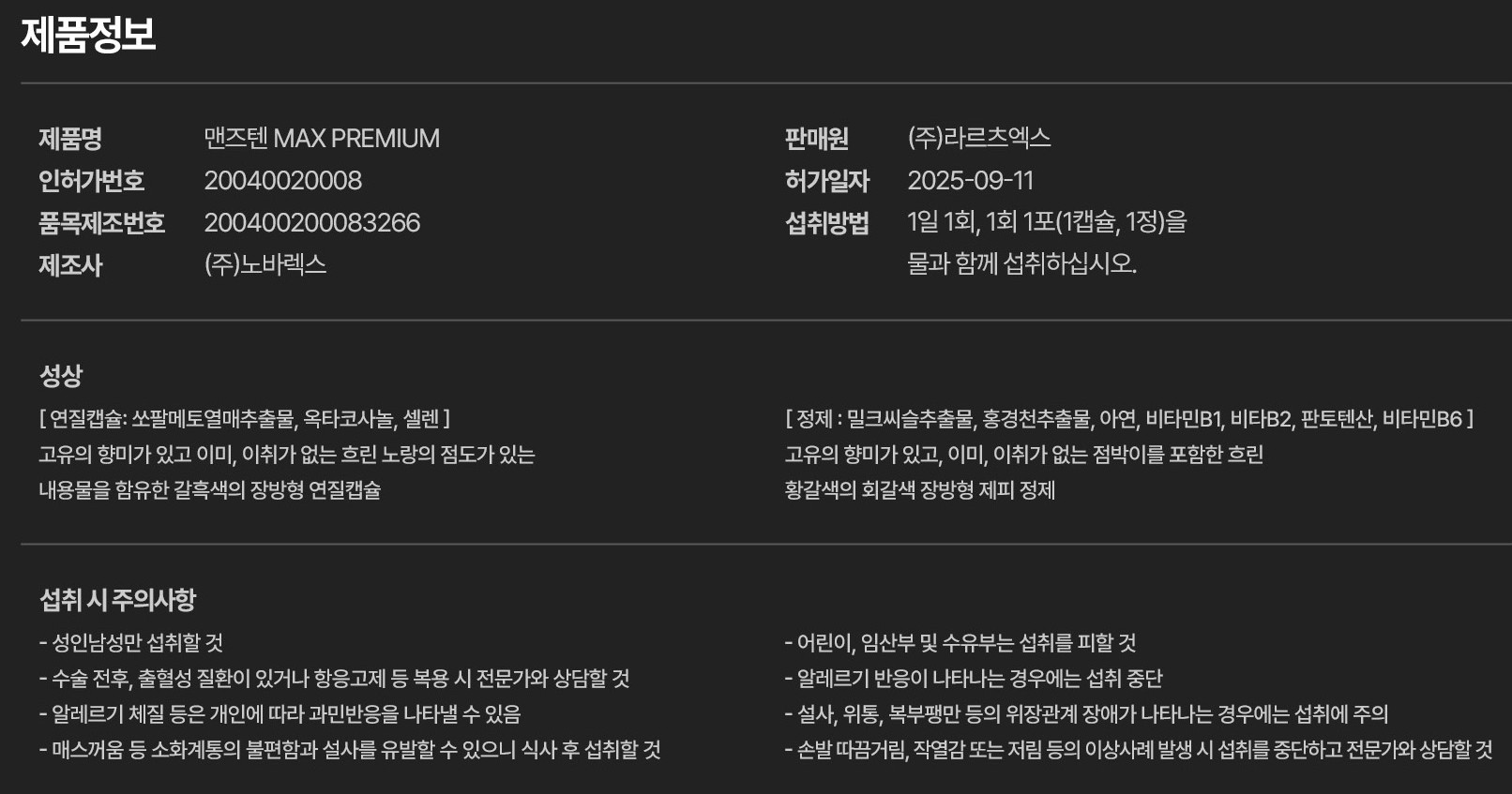 첫째로 원료 배합 특징을 살펴보면 전립선 관리에 도움을 줄 수 있는 식물성 성분과 일상적인 피로 회복을 돕는 기능성 추출물이 함께 포함된다. 이를 통해 전신의 균형 회복을 목표로 한 구성이 특징적이다. 한 종류의 단일 성분이 아니라 복합 구조로 조합돼 있다는 점이 가장 눈에 띈다