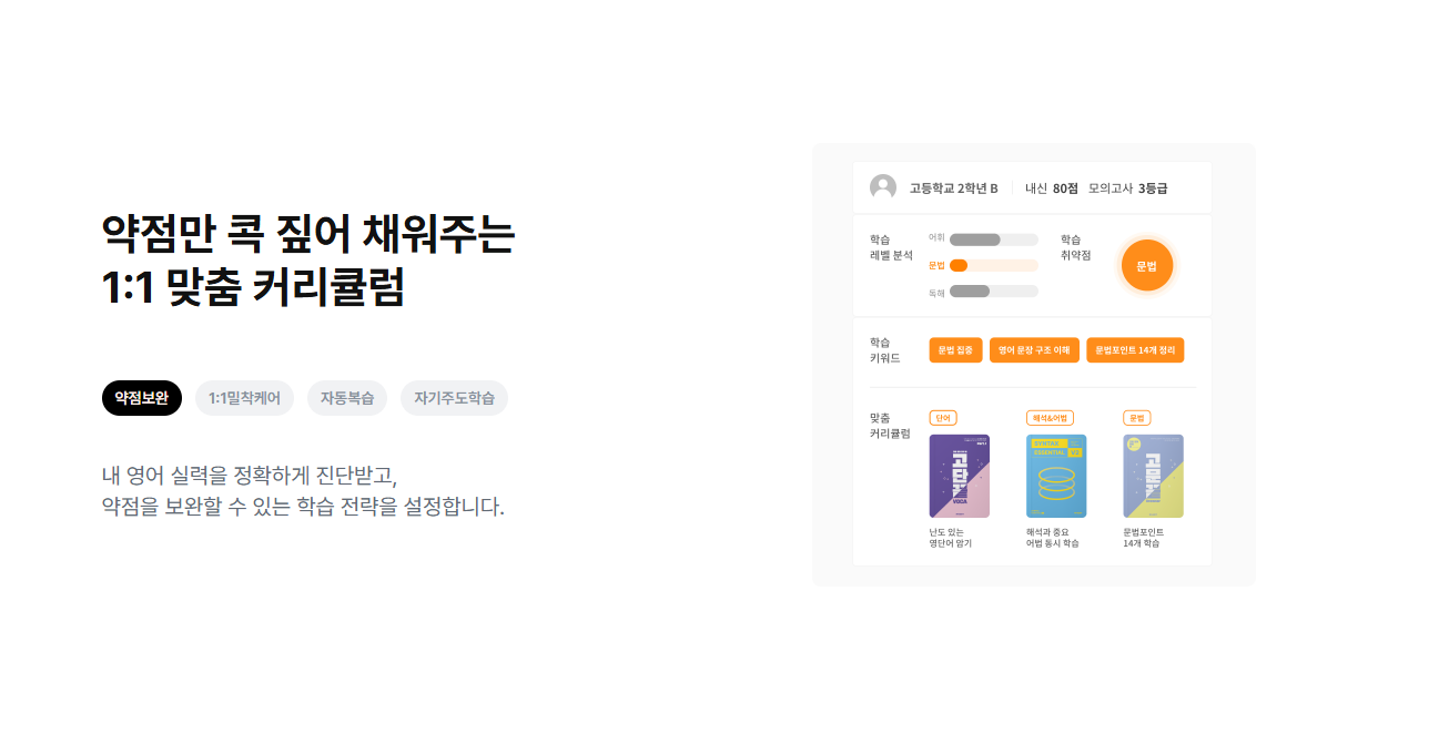 체계적인 문제 제공, AI 기반 진단, 1대1 수업 관리,