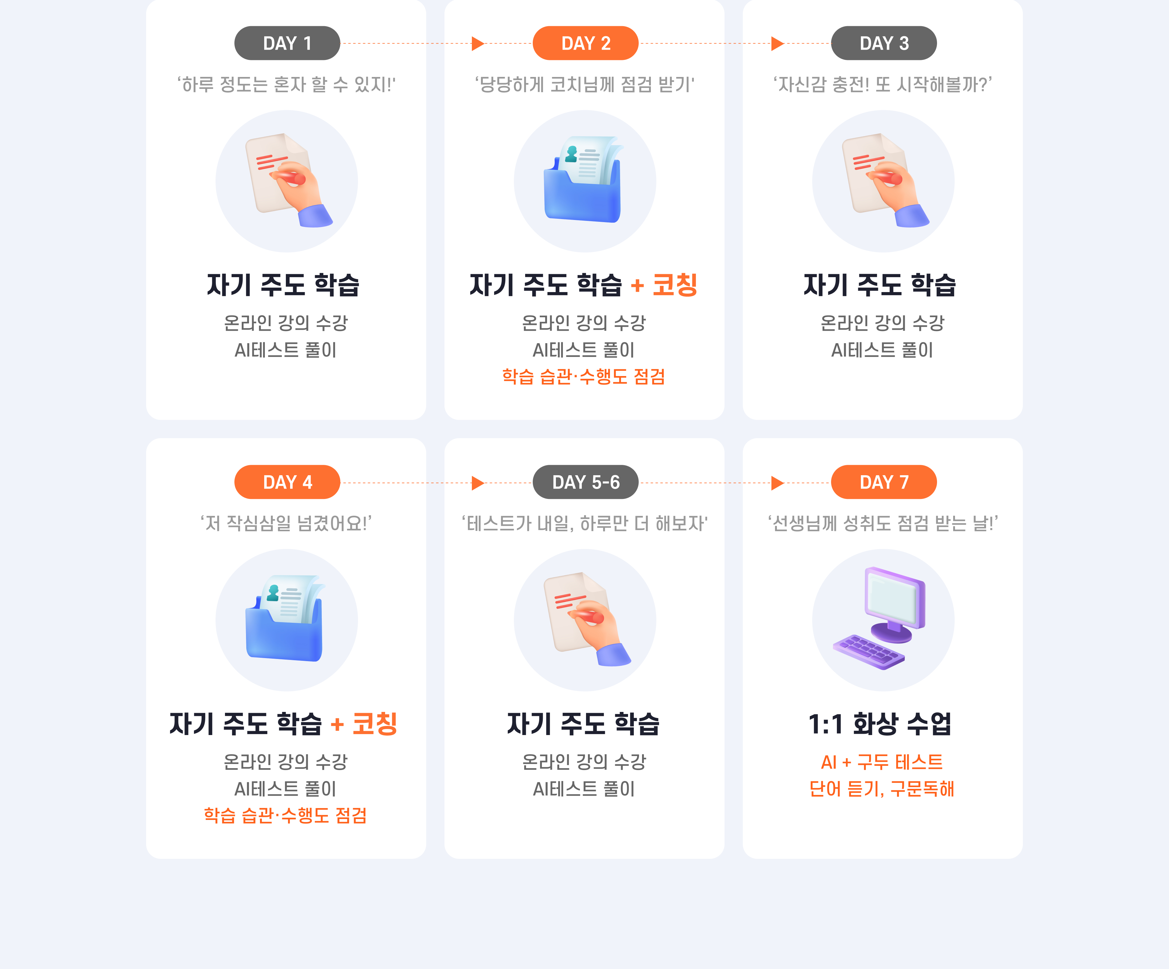 개인 학습 코칭 세션 화상 점검 수업이 순환 구조로 배치된다
